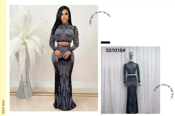 Conjunto de crop top y falda larga con pedrería