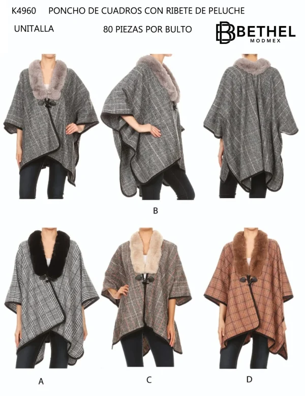 Poncho de cuadros con ribete de peluche