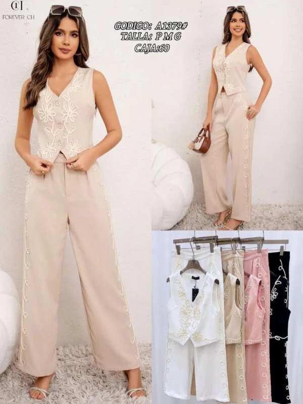 Conjunto de chaleco y pantalón con bordado floral